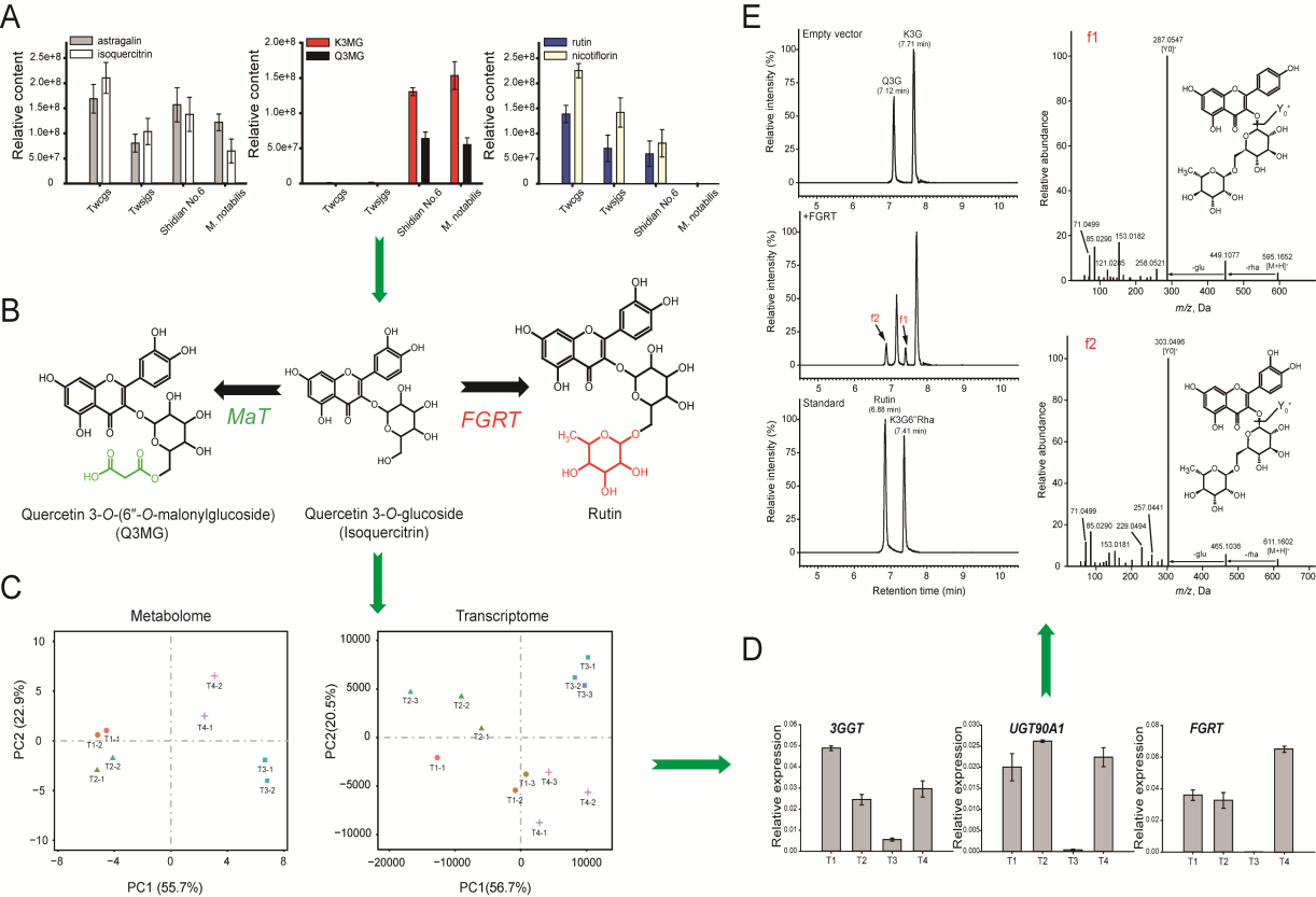 )91份桑树资源为材料,结合自主开发的Segmented Full-MS/MS scan广泛靶向代谢组学研究方法和特异资源转录组分析,构建了包含936个代谢产物的桑树代谢组学数据库-MMHub(//biodb.yiliyp.net/mmdb/),进一步解析了桑树芦丁(rutin)合成代谢的分子机制,并首次报道了一个参与了芦丁合成的关键末端修饰酶F3G6″RT(KT324624)的功能(图1)。