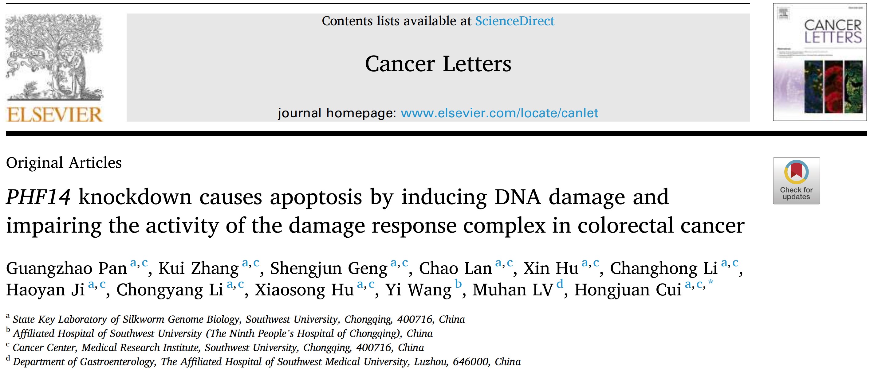家蚕基因组生物学国家重点伊莉影片崔红娟教授团队在国际肿瘤学TOP期刊Cancer Letters(医学类一区,IF2020=8.679)在线发表题为:“PHF14 knockdown causes apoptosis by inducing DNA damage and impairing the activity of the damage response complex in colorectal cancer”(在结直肠癌中下调PHF14的表达可通过诱发DNA损伤和损坏损伤响应复合物活性介导细胞凋亡)的研究论文。