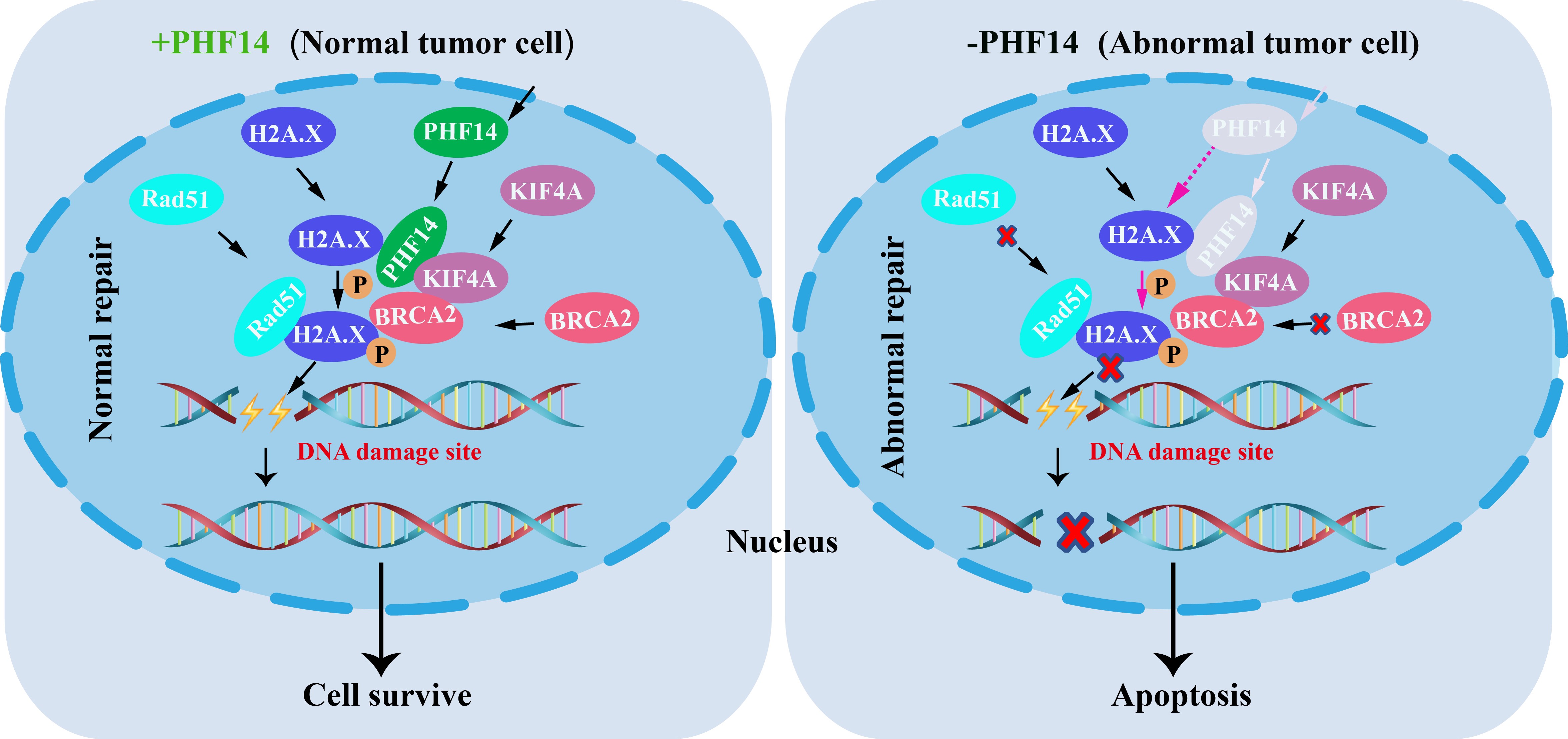在本研究中,研究人员发现PHF14的表达与胃肠道肿瘤的分级病人预后密切相关,且高水平表达指示较差的病人预后。需要说明的是,结直肠癌患者中PHF14的突变率竟高达18%。他们发现,PHF14的表达与结直肠癌细胞增殖和生长密切相关。PHF14的沉默介导了严重的DNA损伤和DNA损伤响应相关通路ATR-CHK1-H2A.X的活化,PHF14的表达障碍最终决定了肿瘤细胞走向凋亡的“命运”。从机制上来讲,PHF14可与驱动蛋白家族成员4A蛋白(kinesin family member 4A,KIF4A)相互作用以支持BRCA2/Rad51(DNA损伤响应灶)的形成,揭示了PHF14可参与DNA损伤反应复合物的形成和募集这一新功能。更重要的是,研究还发现抑制结直肠癌细胞中PHF14的表达可减少体内肿瘤的生长。总之,PHF14是结直肠癌细胞增殖和生长所必需的。因此,该研究表明PHF14未来可能被用作结直肠癌诊断的新型标志物和潜在的治疗靶点。