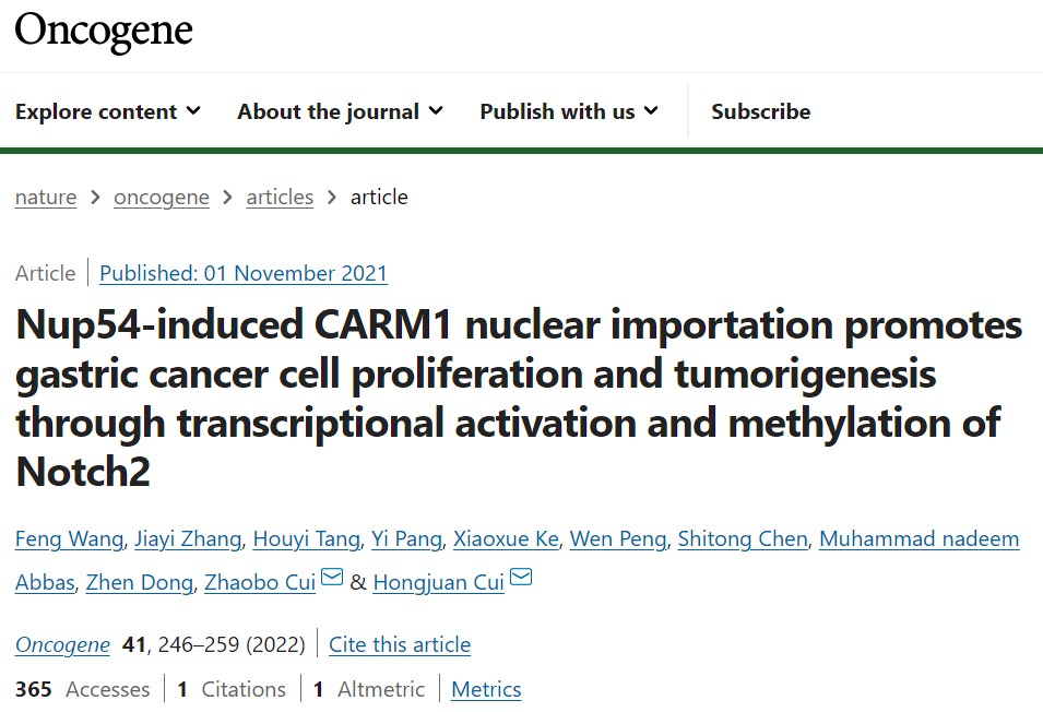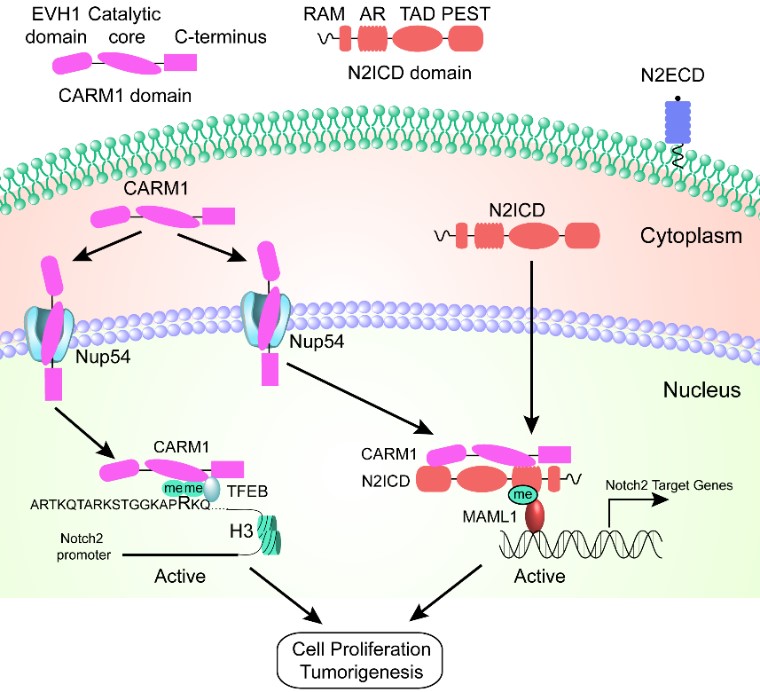 家蚕基因组生物学国家重点伊莉影片崔红娟教授组题为“Nup54-induced CARM1 nuclear importation promotes gastric cancer cell proliferation and tumorigenesis through transcriptional activation and methylation of Notch2”的研究文章。该文章揭示了精氨酸甲基转移酶CARM1通过转录激活和蛋白翻译后修饰调控胃癌细胞增殖和肿瘤发生的机制。