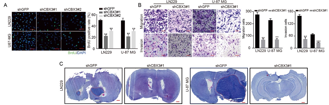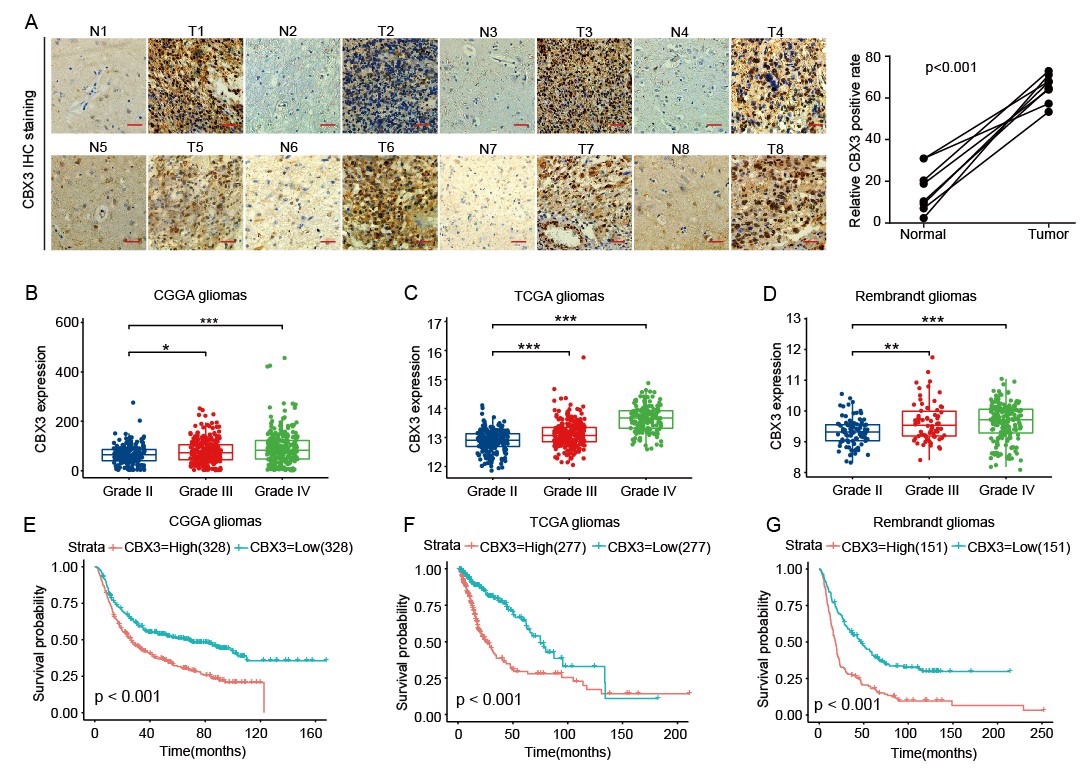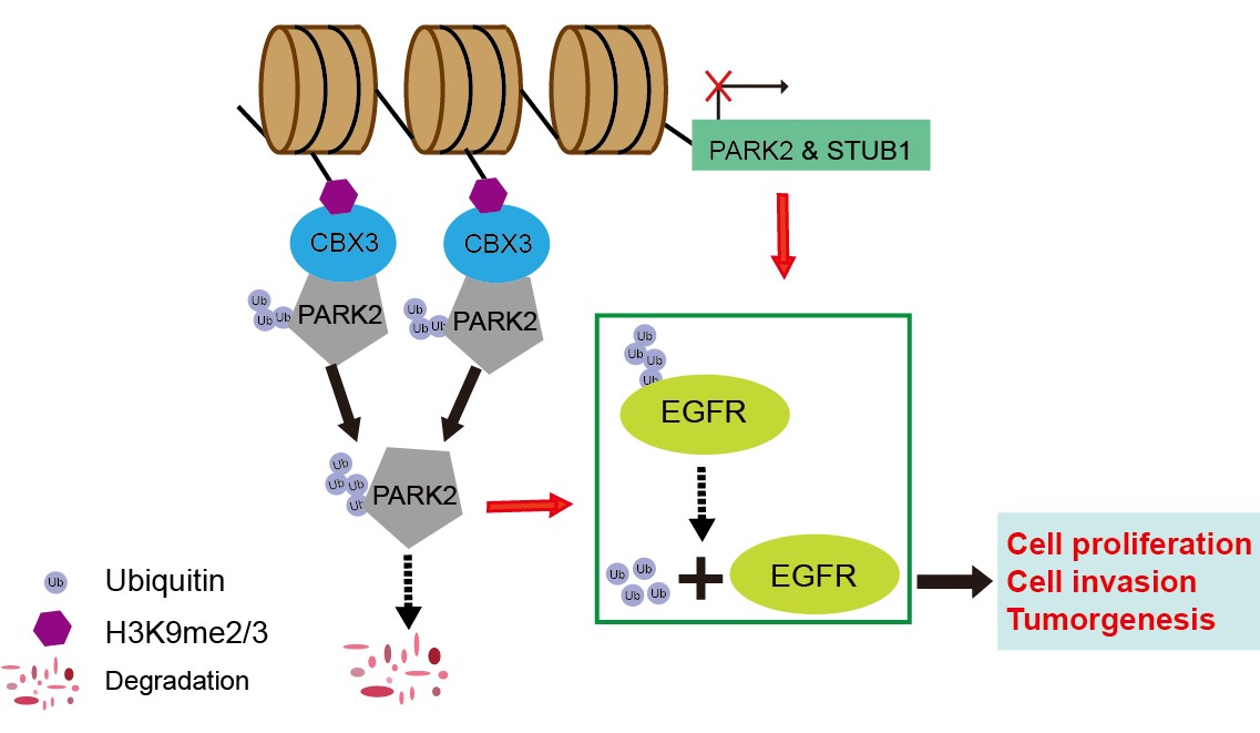 崔红娟教授团队就GBM标志物的筛查、鉴定以及如何管控EGFRGBM的表达开展了深入研究。首先, GBM患者组织的免疫组化病理检测以及生物信息学分析发现一种能够参与异染色质形成的H3组蛋白甲基化阅读器CBX3Chromobox 3)在GBM患者中异常高表达,并且与GBM的预后和恶性分级密切相关。功能检测表明了CBX3 在体外和体内显著促进 GBM 细胞的增殖、侵袭和肿瘤发生。从机制上来说,我们通过Ch-IPCo-IP等一系列生物技术实验证明了CBX3促进GBM 的恶性进展是EGFR 依赖性的,并且进一步揭示了GBM患者发病机理的一条全新的信号通路CBX3-PARK2/STUB1-EGFR。该研究不仅丰富了GBM表观遗传学的研究,也为该信号通路作为GBM潜在治疗靶点的可行性提供了坚实的依据。伊莉影片 2020级博士研究生彭文为第一作者,崔红娟教授为该论文的通讯作者。该研究得到了重庆市自然科学基金和重庆市博士生科研创新项目的支持。