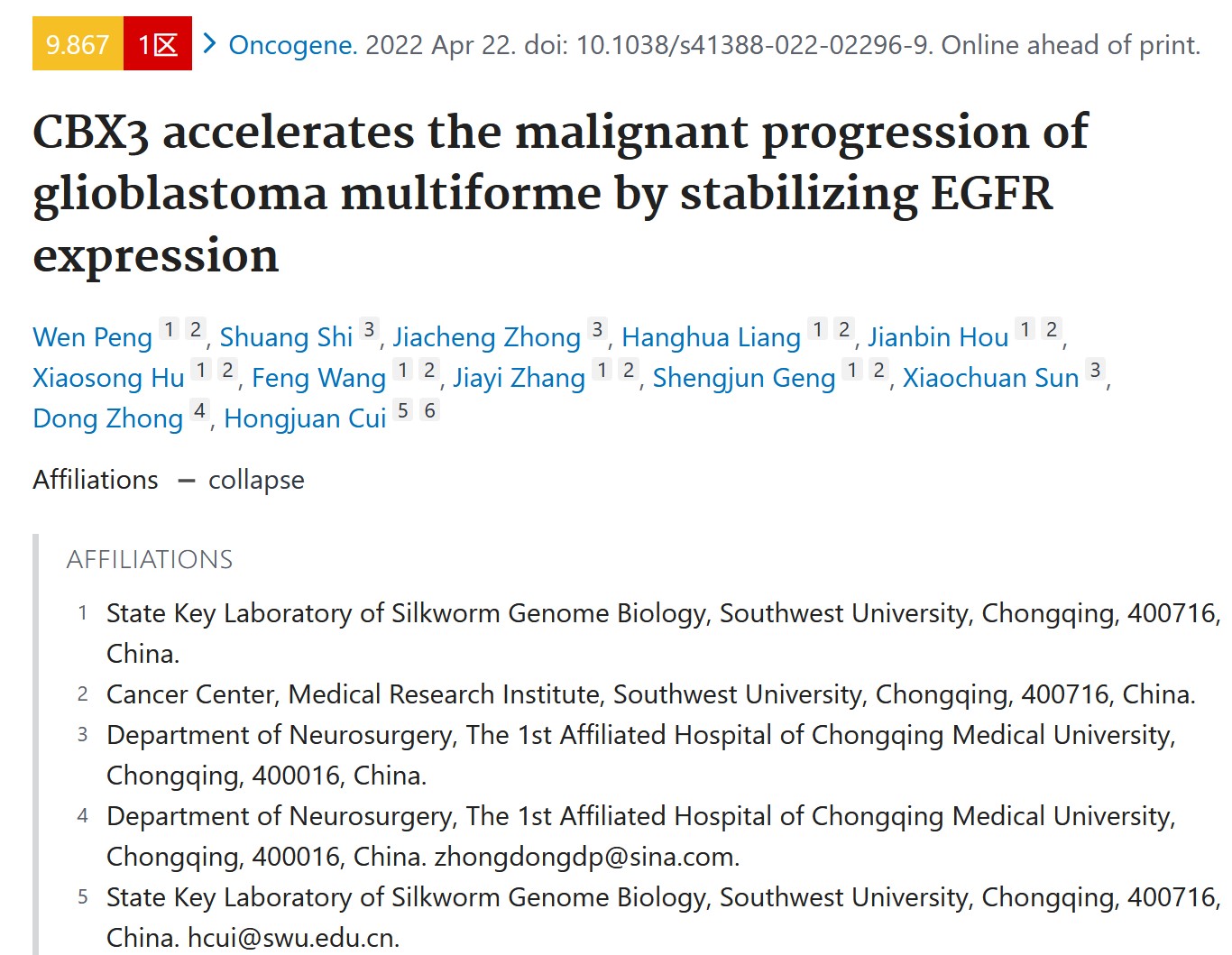 近日, ONCOGENE杂志发表了来自伊莉影片 家蚕基因组国家重点伊莉影片崔红娟教授团队题为“CBX3 accelerates the malignant progression of glioblastoma multiforme by stabilizing EGFR expression”的最新成果。