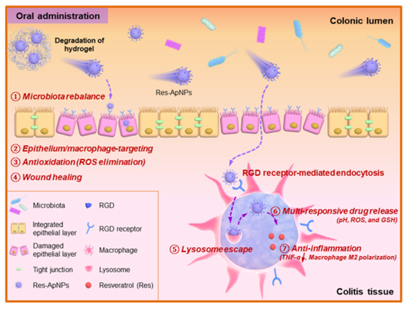我国拥有丰富的蚕丝蛋白资源,通过解析不同蚕丝蛋白的组成及各组份的一级结构、二级结构等,发现柞蚕丝素是一种潜在的能用于炎症治疗的多功能(靶向等)生物质。结肠炎症组织中的结肠上皮细胞和巨噬细胞的表面高度表达整合素蛋白,能与精氨酸-甘氨酸-天冬氨酸(RGD)三肽特异性结合,而柞蚕丝素(ApSF)中恰好含有丰富的RGD三肽结构。基于此,研究团队将桑葚来源白藜芦醇(Res)装载于柞蚕丝素纳米粒子中,获得载Res的纳米药物(Res-ApNPs)。该Res-ApNPs具有结肠上皮细胞/巨噬细胞双重靶向、多重刺激响应和溶酶体逃逸等性能。值得指出的是,Res-ApNPs还能促进炎症缓解、上皮修复、自由基清除和肠道菌群调控等,表明该结构简单、易于制备的基于柞蚕丝素的纳米药物在炎症疾病的治疗方面具有良好的应用前景。该项研究成果于2022年2月发表在生物材料领域重要期刊Biomaterials(IF = 15.4),博士生马雅为论文第一作者,段炼副教授为论文的共同第一作者。同时获得授权国家发明专利1项(专利号:2019 1 0738517 3)。