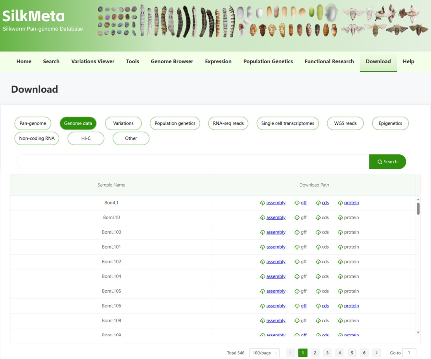 代方银教授团队的最新科研成果——家蚕泛基因组和多组学数据分析平台(SilkMeta)。这是继2022年研究团队发表家蚕泛基因组论文(Nat. Commun., 2022)之后,在家蚕种质资源基因组和生物信息分析领域取得的又一突出进展,标志着团队创建“数字家蚕”的工作迈入新阶段,对于推动家蚕泛基因组成果在功能基因组、基因组选择和分子设计育种等方面的研究应用具有重要意义。
