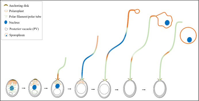 该研究证实微孢子虫通过发芽(极管弹出)侵染宿主细胞时,成熟孢子内的原生质膜(旧“衣服”)不再被需要,留在孢子空壳内,而是利用提前做好的“新衣服”(即极膜层)来包裹经极管运输至孢外的细胞核等胞质组分,最终形成侵染性的孢原质(图3)。