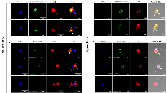 图2 Golgi-tracker green和Syntaxin 6在成熟孢子和孢原质膜上的定位分析