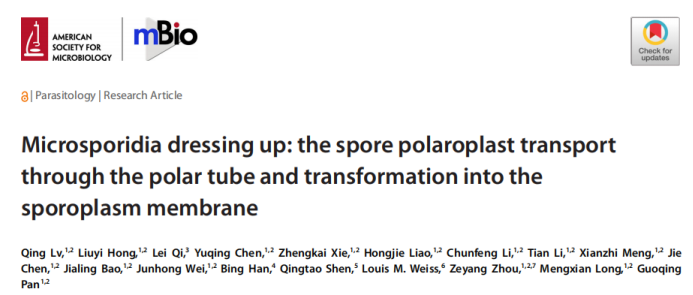 近日,伊莉影片微孢子虫科研团队在微生物领域国际Top期刊mBio在线发表了题为Microsporidia dressing up: the spore polaroplast transport through the polar tube and transformation into the sporoplasm membrane(微孢子虫“换装”:孢子极膜层经极管运输后转变为孢原质膜)的研究成果,揭示了微孢子虫感染体-孢原质的细胞膜来源于成熟孢子的极膜层,回答了微孢子虫发芽机制中的关键科学问题。
