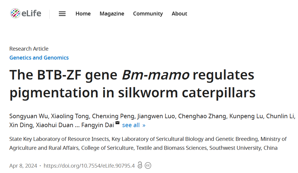 代方银教授团队的最新科研成果“The BTB-ZF gene Bm-mamo regulates pigmentation in silkworm caterpillars”。该项研究揭示了一个锌指蛋白基因调控家蚕幼虫体色模式的功能及机制。