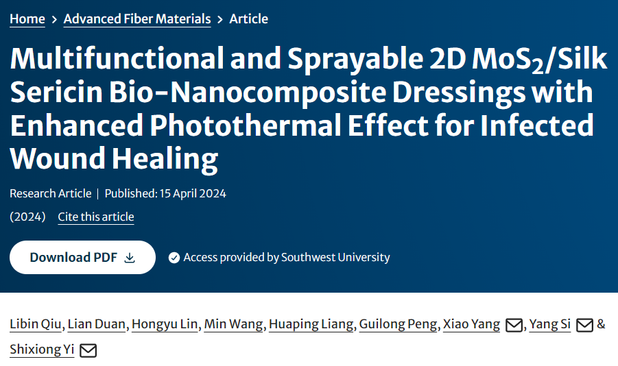 2024年4月16日,易世雄副教授团队在纺织材料学科领域1区Top期刊Advanced Fiber Materials(影响因子16.1)上在线发表题为“Multifunctional and Sprayable 2D MoS2/Silk Sericin Bio‑Nanocomposite Dressings with Enhanced Photothermal Effect for Infected Wound Healing”的研究论文。