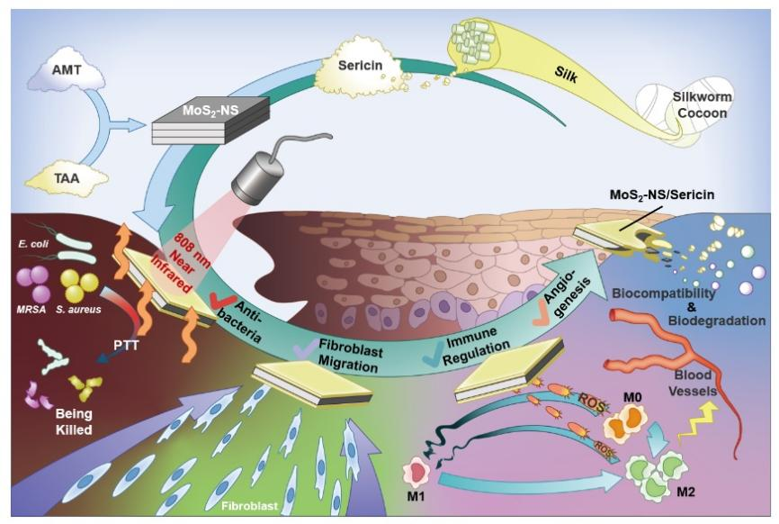 在缫丝、染练、丝织和丝绵生产加工过程中,脱去的丝胶作为废弃物,不仅浪费大量生物资源,而且造成水质污染。本研究使用丝胶蛋白对片层二硫化钼进行有效剥离,通过提高二硫化钼的分散性以及光热活性,开发出基于丝胶/二硫化钼的喷雾型感染创伤敷料。该敷料不仅具有高效抗菌性能,而且具有促进细胞迁移、免疫调节、加速血管生成以及促进创伤愈合的作用。该研究为丝胶蛋白的回收利用提供了一个新的视角。