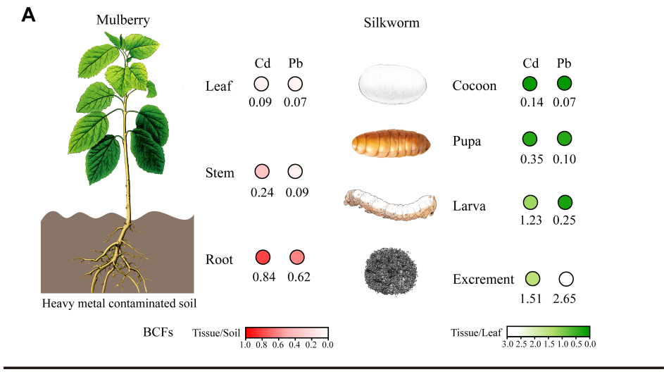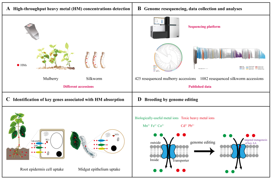蚕桑产业在中国、印度等国家的农业农村发展中占有重要地位,为经济增长、可持续发展和文化传承做出了突出贡献。除了提供高品质蚕茧以支撑丝绸工业外,桑-蚕系统中的桑(根、枝、叶、果)、蚕(蛹、茧)甚至排泄物(蚕沙)等生物质资源在生态、食品、饲料、医药、新材料等领域展现出巨大的开发价值。据统计,中国蚕桑全产业链年总产值超过3000亿元,解决了超过2000万农村劳动力的就业问题。然而,由于人口增长和耕地减少,扩大桑树种植规模在传统耕地上面临着与粮食作物竞争的矛盾。与此同时,中国城市工矿场地周边耕地受到严重的重金属污染,污染区面积接近亿亩,对这些地区进行重金属污染防治和安全利用是国家的重大需求。近年来,重金属胁迫下的蚕桑相关研究逐渐增多,利用桑-蚕系统对重金属污染土壤进行安全利用和修复备受关注。