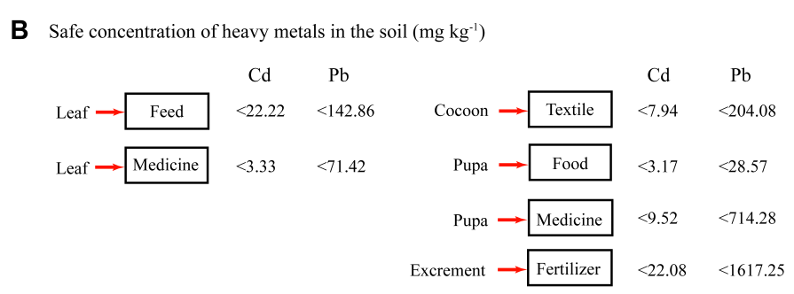 该论文的主要结论包括:(1)桑树具有良好的重金属耐受性,吸收的重金属主要积累在根部且向地上组织转运能力弱,加上家蚕摄入的大部分重金属通过蚕沙排出体外,故家蚕体内及其蚕茧的重金属含量极低,是SMSS安全利用的重要基础;(2)基于桑蚕产品重金属安全含量的国家标准和SMSS不同部位重金属的生物富集系数,确定了SMSS安全利用土壤重金属浓度范围;(3)基于影响SMSS重金属耐受和积累的多种因素,提出了一个决策模型,以指导SMSS在污染地区的应用;(4)高通量重金属检测、多组学和大数据分析、基因编辑等新技术对创制更适合重金属污染地区桑蚕品种具有重要推动作用。