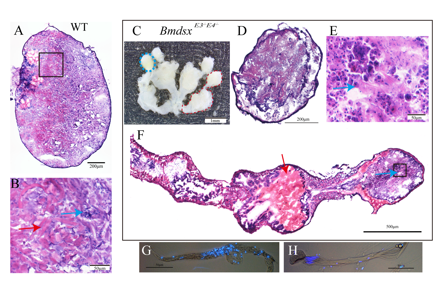 进一步通过HE染色观察BmdsxE3-/-E4-/-突变雌性(ZW)的睾丸样组织切片,可见纤维状结构聚集形成类似精子束的形态。通过DAPI染色证实突变体的睾丸样组织中存在精子束,且观察到有核精子和无核精子两种类型,与野生型雄性的精子分化模式一致(图4)。