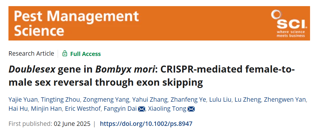 资源昆虫高效养殖与利用全国重点实验童晓玲教授课题组在中科院1区TOP期刊Pest Management Science上发表题为“Doublesex gene in Bombyx mori: CRISPR-mediated female-to-male sex reversal through exon skipping”的研究论文。该研究首次通过精准编辑家蚕性别决定关键基因Bmdsx(Bmdoublesex)的雌特异性外显子剪接位点,成功实现了家蚕雌性向雄性的性别逆转,为经济昆虫育种及害虫生物防治开辟了新的技术路径。
