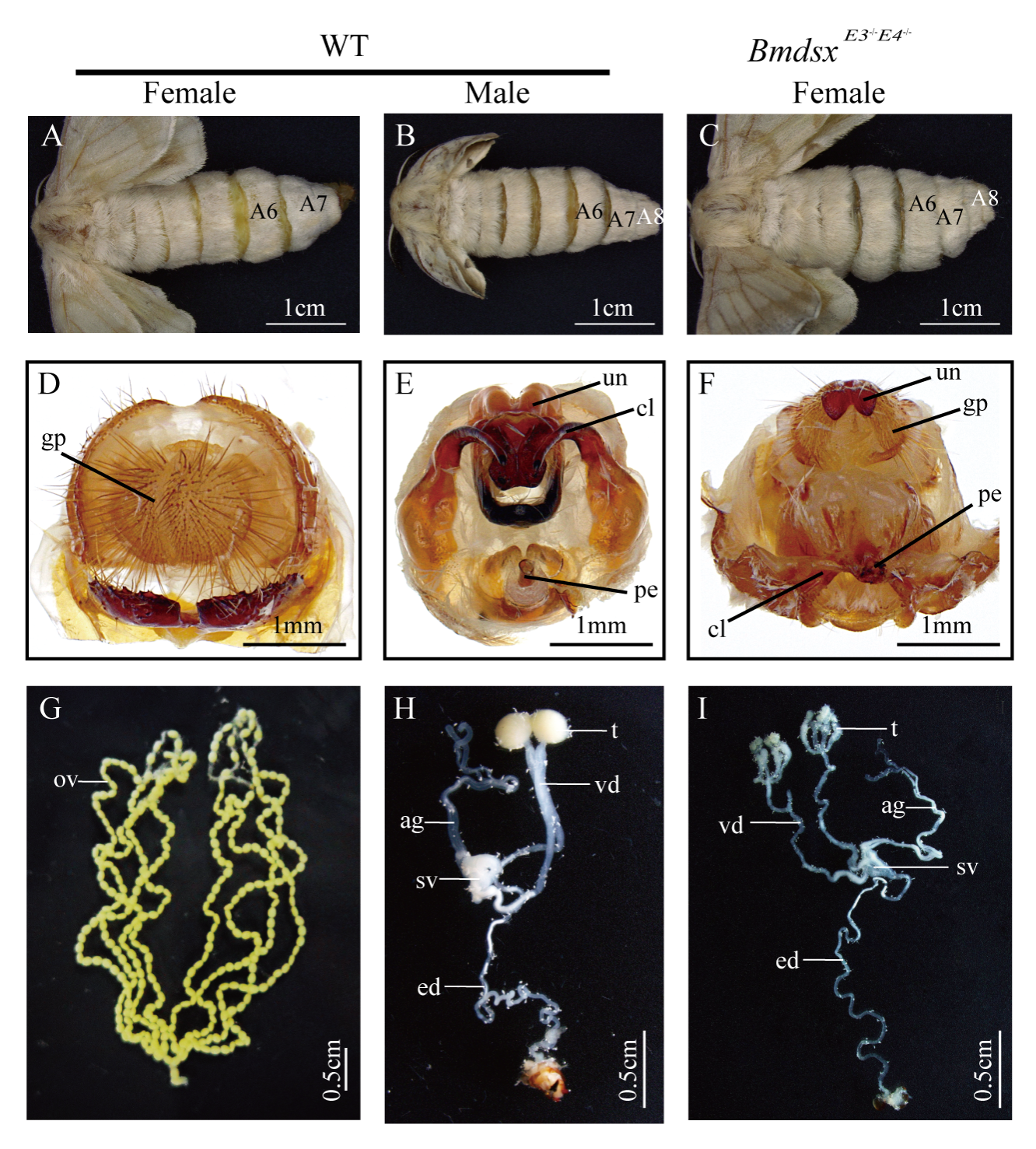 图3. 家蚕野生型(WT)和BmdsxE3−/−E4−/−雌性突变体的表型特征