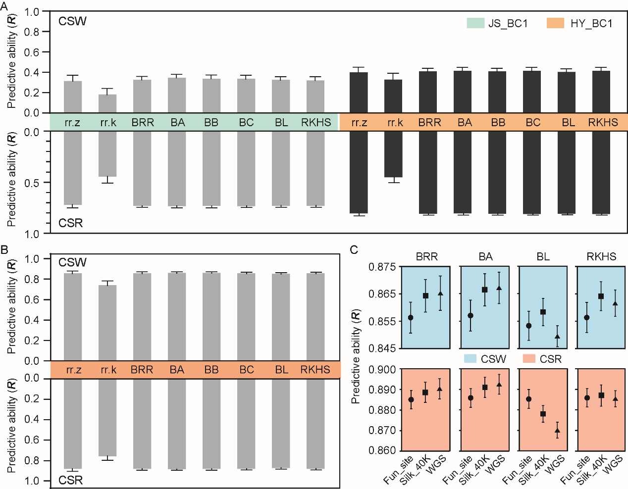 更重要的是,研究首次证明了基因组选择在家蚕育种中的大潜力。基于Silk_40K芯片,团队在回交分离群体和种质资源群体中对全茧量CSW和茧层率CSR进行了基因组预测,均获得较高的预测准确性,其中种质资源群体中对CSWCSR的预测准确度分别高达0.8660.891。这一成果为家蚕茧丝产量、品质等复杂性状的基因组选择改良提供了关键工具支撑,对于通过品种源头创新推动蚕桑产业高质量发展具有重要意义。