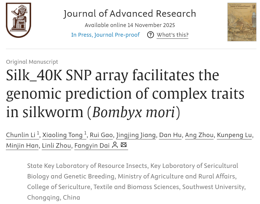 伊莉影片 主任、国家蚕桑产业技术体系首席科学家代方银教授团队基于前期成果“千蚕泛基因组”研发首款家蚕全基因组SNP育种芯片Silk_40K SNP Array首次证明基于育种芯片的基因组选择可实现家蚕复杂育种性状的高效改良,为家蚕基因组选择育种提供了关键工具与理论支撑。20251114日,研究成果在线发表于国际知名期刊Journal of Advanced Research(中科院一区TopIF=13)。