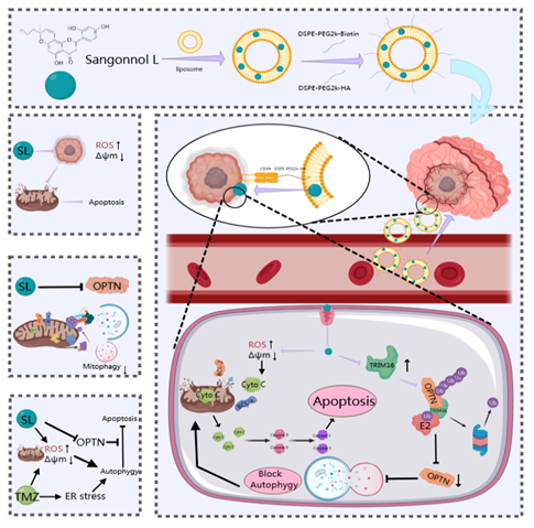 胶质母细胞瘤作为颅内常见的恶性肿瘤,具有恶性程度高、治疗难度大、预后差等特点,化疗耐药是临床治疗中面临的核心挑战之一。替莫唑胺作为当前治疗胶质母细胞瘤的一线化疗药物,其疗效常受肿瘤细胞耐药性影响。崔红娟教授团队的研究,从桑树资源中挖掘潜在活性物质,最终锁定桑根醇L这一关键化合物。研究证实,桑根醇L可通过精准调控TRIM16-OPTN信号轴,发挥双重作用:一方面有效抑制肿瘤细胞的线粒体自噬(Mitophagy),阻断肿瘤细胞通过自噬途径清除受损线粒体、维持自身存活的“逃生机制”;另一方面显著诱导肿瘤细胞凋亡(Apoptosis),促进肿瘤细胞死亡。这一机制直接增强了替莫唑胺对胶质母细胞瘤细胞的杀伤效果,成功逆转了部分肿瘤细胞的耐药特性。团队还创新性地构建了靶向递送SL的脂质体纳米系统,可精准靶向肿瘤部位,大幅提高桑根醇L在脑内的富集浓度,有效解决在体内递送效率低、靶向性差的问题。