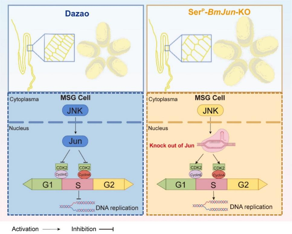 本研究揭示了JNK信号通路及其下游BmJun基因对家蚕细胞周期和丝腺核内复制的贡献。证明了BmJun基因能够诱导BmN-SWU1细胞发生G0/G1期阻滞,降低DNA合成速率,抑制M期细胞分裂过程,并降低细胞的增殖活性。同时发现,丝腺(MSG)中敲除BmJun基因导致细胞体积增大30%MSG直径扩20%,茧丝增粗17%,同时蚕丝产量增加16%。此外,本研究还证实,BmJun基因能够靶向BmCDK2BmCyclinABmCyclinE基因的启动子,从而发挥负调控功能。这些发现为深入了解Jun蛋白家族和BmJun基因在核内复制中的功能和作用机制提供了新的见解。同时也为蚕丝腺的遗传改良提供了分子靶标,在家蚕分子育种中具有重要的应用价值