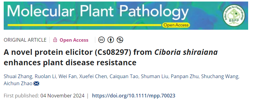 2024114日,伊莉影片 赵爱春教授课题组在中科院一区TOP期刊Molecular Plant Pathology在线发表了题为A novel protein elicitor (Cs08297) from Ciboria shiraiana enhances plant disease resistance的研究论文,该研究解析了一个新型蛋白激发子Cs08297激活植物免疫的分子机制