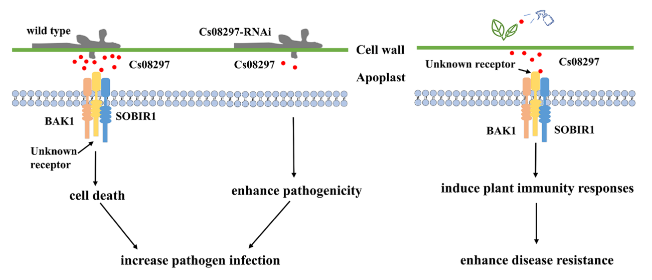 1. 效应蛋白Cs08297调控植物免疫的机制及其应用于绿色防治的工作模型