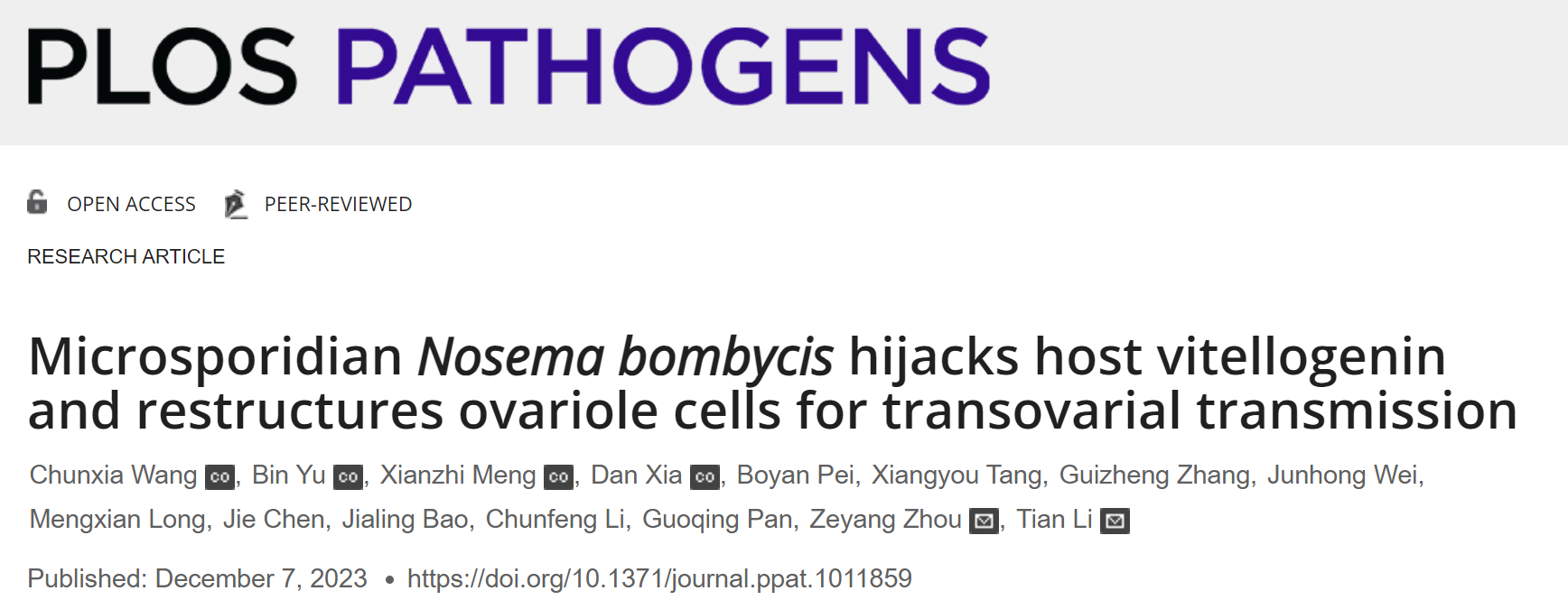 近日,伊莉影片李田研究员课题组在微生物学Top期刊PLoS Pathogens在线发表了题为“Microsporidian Nosema bombycis hijacks host vitellogenin and restructures ovariole cells for transovarial transmission”的研究论文,揭示了家蚕微孢子虫侵入家蚕卵母细胞的时间、路径、形态、策略和关键分子机制。