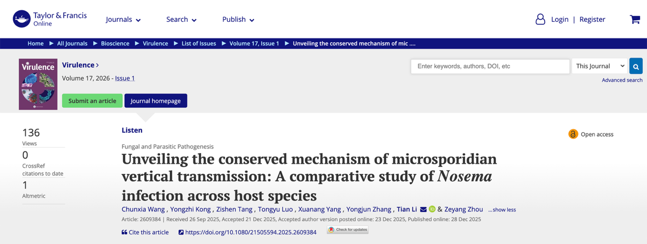 2025年12月28日,资源昆虫高效养殖与利用全国重点实验室微孢子虫研究团队在中科院一区TOP期刊《Virulence》在线发表了题为“Unveiling the conserved mechanism of microsporidian vertical transmission: A comparative study of Nosema infection across host species”研究论文,揭示了不同微孢子虫在不同昆虫宿主中垂直传播过程和机制的保守性与特异性。
