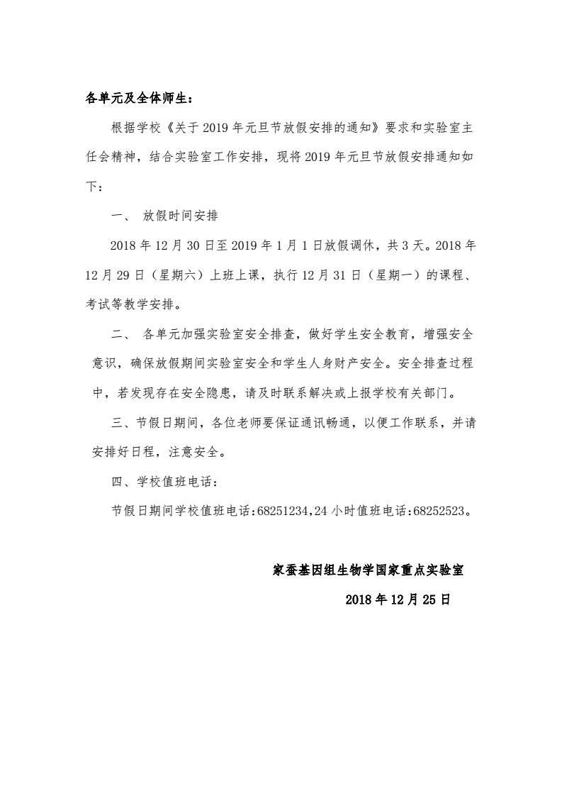 家蚕基因组生物学国家重点伊莉影片关于2019年元旦节放假安排的通知