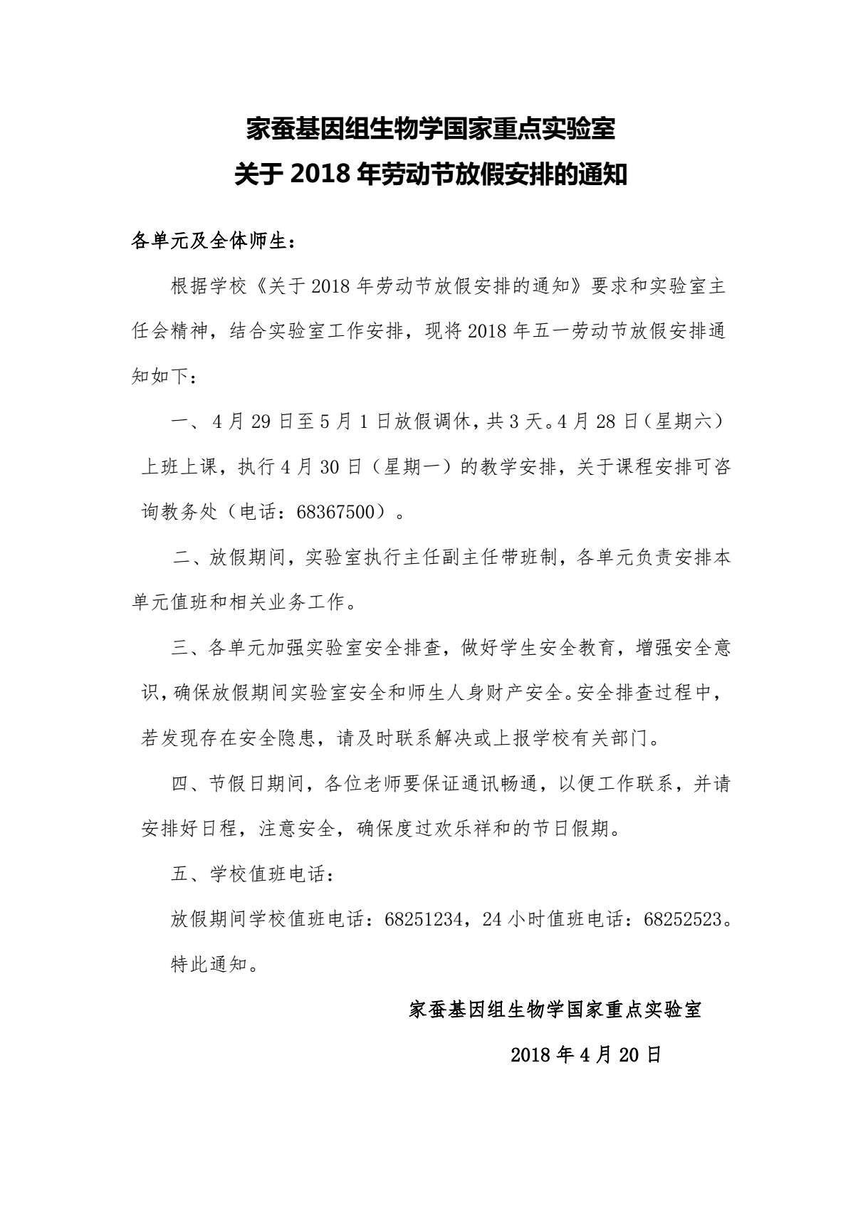 关于2018年劳动节放假安排的通知