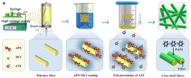 丝素蛋白具有良好的生物相容性、自降解性和力学性能。课题组在此前的研究中将丝素蛋白和聚乳酸羟基乙酸混合纺丝制备出具有力学性能优异和生物相容性更佳的复合薄膜,再通过添加活性导电材料,可制备出具有三维精巧结构的蚕丝基压阻式传感器(International Journal of Biological Macromolecule,中科院JCR一区;Advanced Electronic Materials,中科院JCR二区)。在此基础上,本研究利用丝素蛋白静电纺丝,通过制备的再生丝素蛋白纤维膜吸收大量的水分子,形成有利于聚合反应的丰富水膜环境,延长聚合反应过程,促进导电聚苯胺均匀稳定地在纤维上生长,极大地提升导电活性材料的质量和组装传感器的综合性能,为传感器的应用提供电子传输基础。