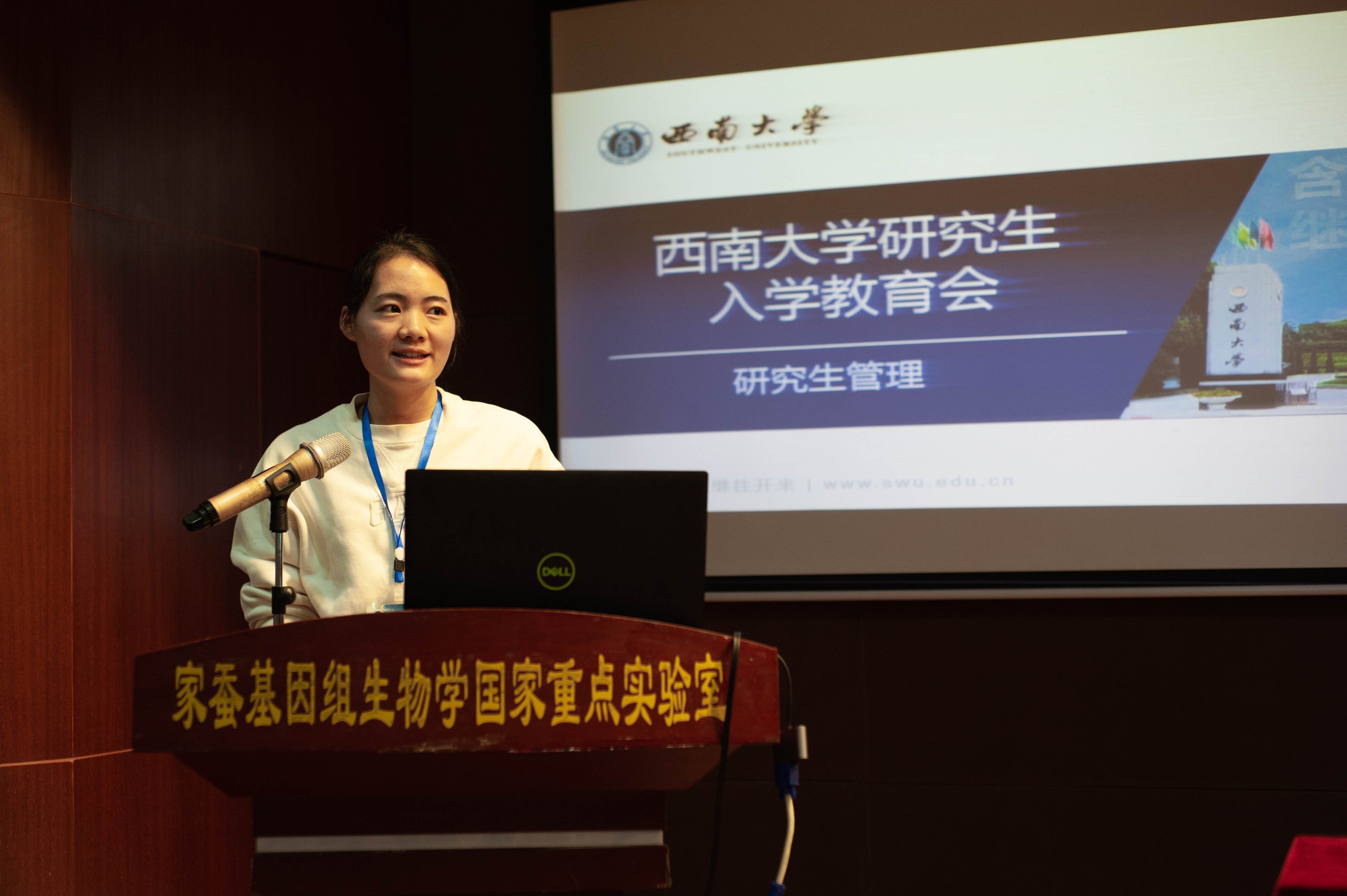 大会最后,由辅导员蔡晓霞老师对新生开展入学教育。她简要介绍了伊莉影片研究生会的组成,接着从研究生的管理、培养和发展三个部分进行阐释,重点强调了研究生培养环节的要求。