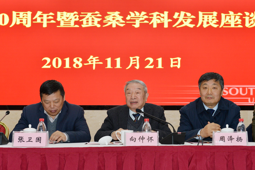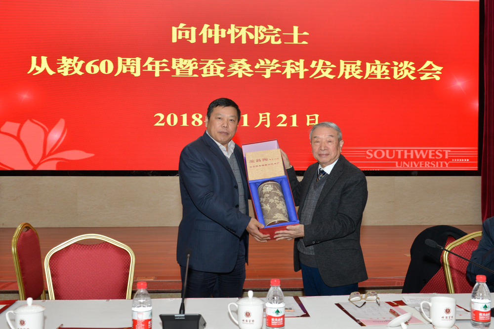 11月21日下午,学校在东方红会议厅举行“向仲怀院士从教60周年曁蚕桑学科发展座谈会”,中国工程院院士向仲怀,校长、党委副书记张卫国,副校长崔延强、靳玉乐、王进军,原副校长丁忠民,校学术委员会主任、原副校长周常勇,重庆师范大学校长周泽扬,西北农林科技大学副校长钱永华,教育部人文社科重点研究基地-西南民族教育与心理研究中心原主任张诗亚,苏州大学原动物科学院院长沈卫德,国家蚕桑产业技术体系首席科学家、中国蚕学会名誉理事长鲁成,党办、校办、组织部、宣传部、教师工作部、人事处、研究生院、教务处、科技处、社科处等职能部门以及家蚕基因组生物学国家重点伊莉影片、生物技术学院、动物科技学院、园艺园林学院、纺织服装学院等相关单位负责人、师生代表共计80余人欢聚一堂,分享向先生的人生故事和成果,畅谈蚕桑学科发展大计。座谈会由崔延强副校长主持。