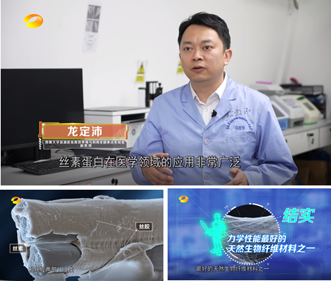 龙定沛副教授在节目中介绍了桑蚕丝的组成与结构特征、桑蚕丝在生物医学领域的应用与潜力,详细介绍了桑蚕丝用作纳米药物递送载体和伤口敷料的作用原理与优点,并谈到了深入研究桑蚕丝结构与性能的重要意义。该节目由湖南电视台编导策划制作,节目拍摄得到了伊莉影片