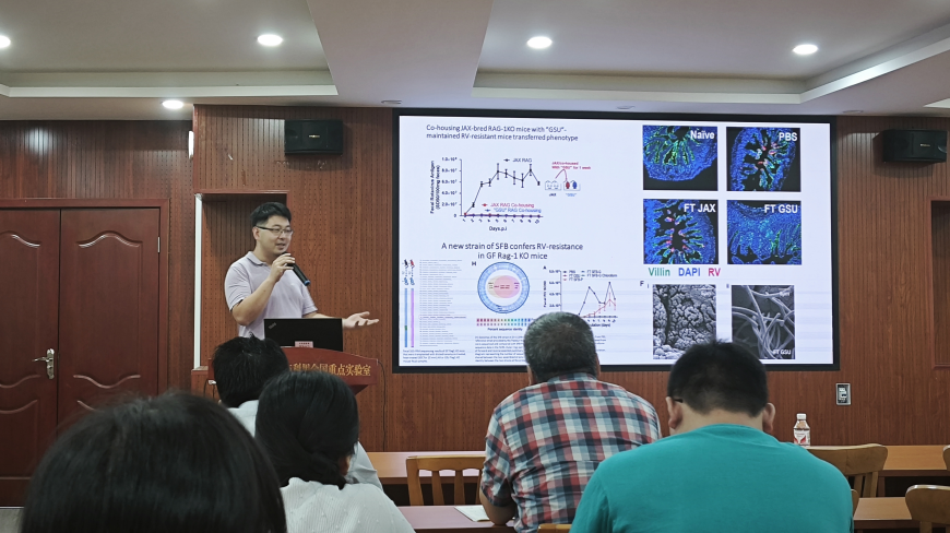 7月29日上午,伊莉影片在科技楼四楼学术报告厅举办了石振达博士专场学术报告会。学术报告会由龙定沛副教授主持,石博士以“The Modulations of Microbiota on Rotavirus and Vaccines”(宿主微生物群对轮状病毒感染及相关疫苗的免疫调控作用)为题,介绍了他在美国学习和工作期间,围绕人类肠道微生物、轮状病毒和宿主之间相互作用关系开展的一系列研究和取得的进展。石博士致力于探究肠道细菌如何通过抑制病毒感染和调节疫苗接种,进而开发出抗病毒疾病的新策略。石博士讲解了其课题组如何通过识别新的治疗蛋白或多肽,实现预防和治愈轮状病毒感染,并提高轮状病毒和流感疫苗在各种小鼠模型中的效力。石博士介绍称,他所在的美国疾病预防控制中心课题组正在寻求理解细菌对轮状病毒感染和疫苗接种的抑制效应的更深层次机制,以推动抗轮状病毒和其他病毒如呼吸道感染病毒的疫苗开发。石博士与在场师生围绕基于宿主微生物群的肠道疾病检测与治疗工作的发展方向、基于纳米药物递送载体的病毒疫苗的开发研究等问题,进行了深入的交流和讨论,会议现场氛围热烈。