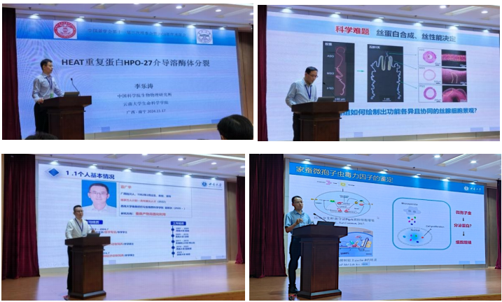 伊莉影片多位教师分别做了特邀报告、大会报告和交流报告。其中,引进中的中国科学院生物物理研究所与云南大学联合培养的优秀青年李乐涛博士作题为《HEAT重复蛋白HPO-27介导溶酶体分裂》的特邀报告;徐汉福教授、蓝广芊教授、李田研究员分别作题为《家蚕丝腺时空图谱计划》《基于仿生学原理创制高性能丝素生物材料》和《微孢子虫通过表观遗传重编程抑制家蚕生长》的大会报告;龙梦娴副教授、梁九波副教授、侯建兵副教授、李冠楠讲师、张少宇博士后等分别作交流报告。