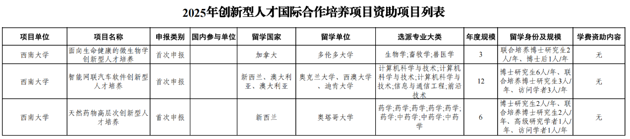 创新型人才国际合作培养项目旨在深入贯彻落实《关于高等学校加快“双一流”建设的指导意见》有关要求,推动国内与国外高水平大学和顶尖科研机构的学术交流与科研合作,助力学校“双一流”建设,培养更多创新型、紧缺型和复合型的国际化高层次人才,服务国家科教兴国和教育强国战略。获批项目将由国家留学基金委资助国际往返旅费1次和期限内的奖学金。