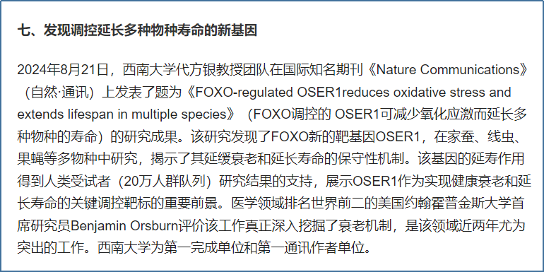 1月9日,重庆科技发展战略研究院发布了2024年度“重庆市基础研究代表性成果”,我室代方银教授团队的研究成果“发现调控延长多种物种寿命的新基因”入选,在入选的12项成果清单中位列第七。