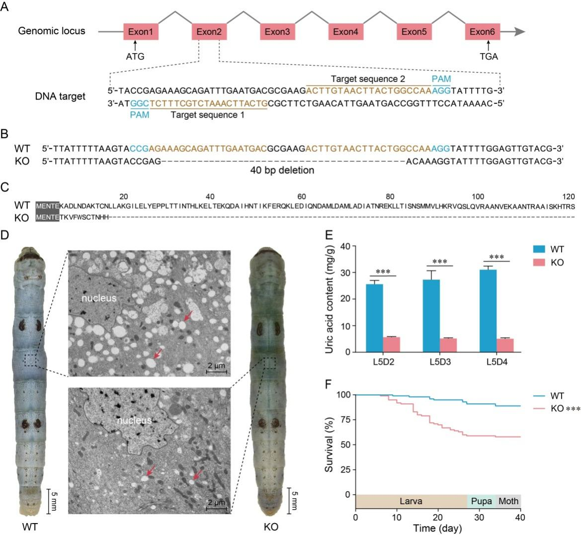 本研究结合家蚕高质量泛基因组数据和经典遗传连锁图谱,实现了快速且准确鉴定家蚕突变体负责基因的目标,研究结果为家蚕尿酸代谢调控提供了新的证据。
