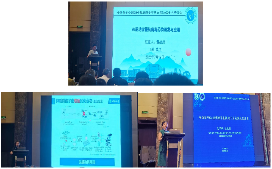 交流报告环节,董战旗副研究员、陈洁副教授和龙梦娴副教授分别作了题为“AI驱动家蚕抗病毒药物研发”“高通量微孢子虫抑制剂筛选与功效研究”“转录因子Ste12调控家蚕微孢子虫成熟及其应用”的交流报告。李田副主任和董战旗副研究员受邀分别参与主持交流报告。