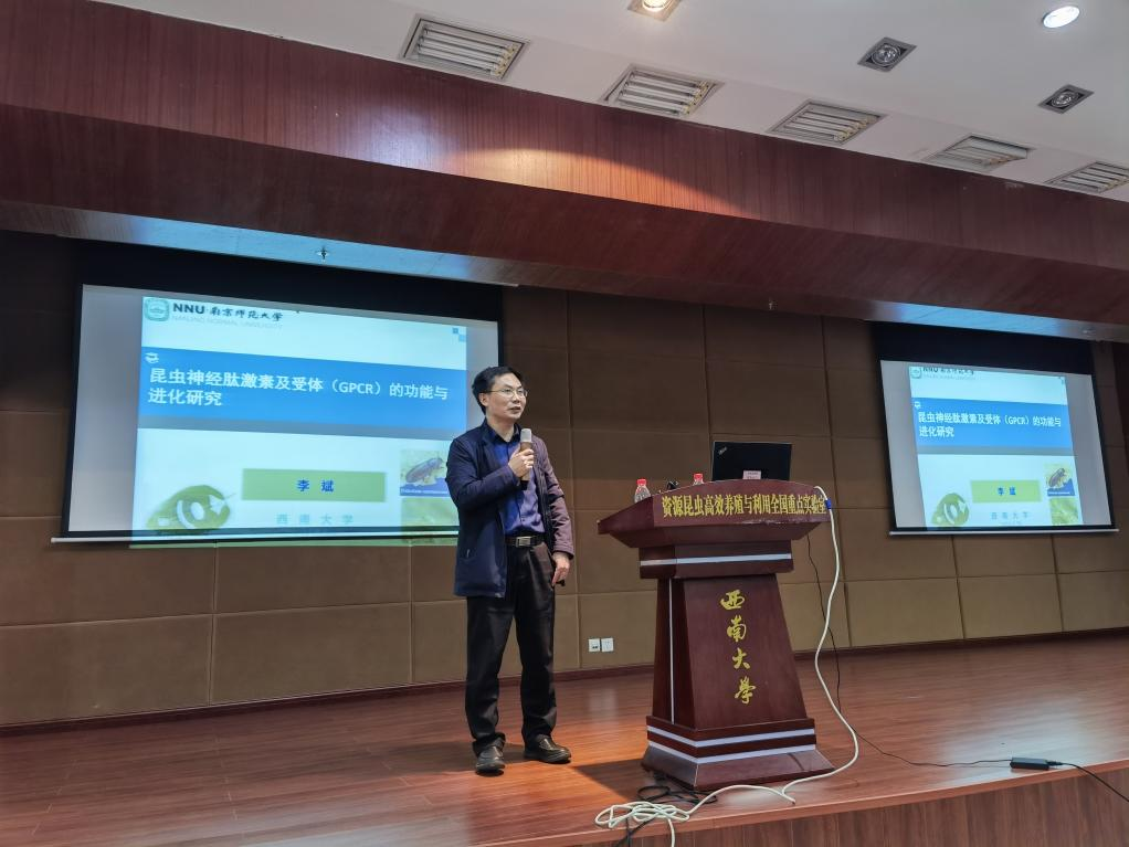 在蚕学宫报告厅,李斌教授做了专题报告会。报告会上,伊莉影片主任代方银教授首先代表伊莉影片对李教授的到来表示欢迎,并简要介绍了李教授与伊莉影片的亲密联系,以及李教授过去对伊莉影片的建设和发展所作出的贡献。李斌教授报告题目为“昆虫神经肽激素及受体(GPCR)的功能与进化研究”,主要介绍了其团队利用基因组学等方法,解析了模式昆虫赤拟谷盗的基因组和进化,并着重介绍了昆虫神经肽激素受体的进化与功能研究。李教授团队研究取得了一系列重要进展和成果,为昆虫学的发展作出了积极贡献,也为蚕学研究提供了重要参考。李教授的报告受到与会师生的热烈欢迎,现场师生与李教授开展了热烈讨论和交流。